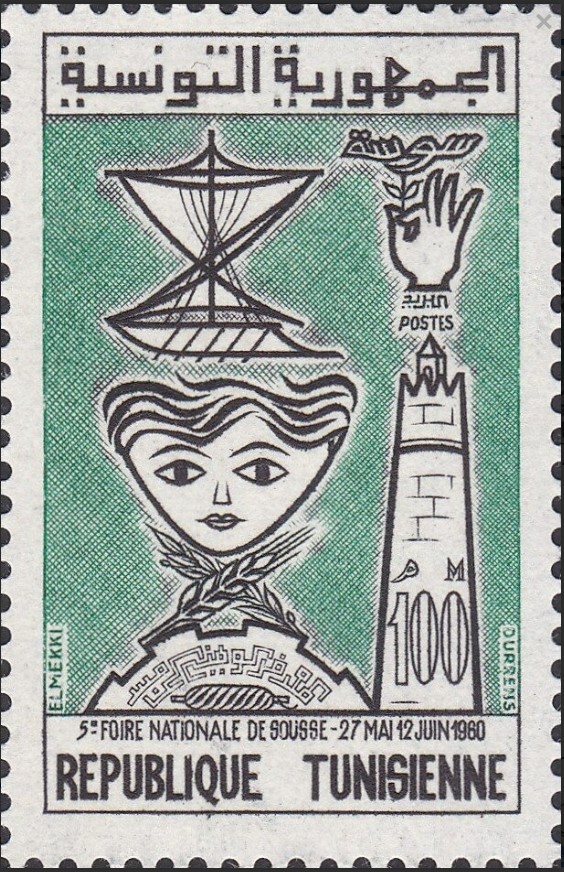 Ce timbre tunisien, émis pour la 5ᵉ Foire Nationale de Sousse organisée du 27 mai au 12 juin 1960, met en valeur un événement économique majeur visant à promouvoir les productions nationales, l’artisanat et le dynamisme commercial du pays. La Foire de Sousse constituait alors une vitrine du savoir faire tunisien, offrant un espace où se croisaient innovation, traditions, agriculture, industrie et échanges régionaux. L’iconographie du timbre — mêlant motifs architecturaux, symboles commerciaux et éléments décoratifs — reflète la vocation de la foire : soutenir la modernisation économique tout en affirmant l’identité culturelle tunisienne. Cette émission souligne le rôle de ces manifestations nationales dans la consolidation du développement économique peu après l’indépendance.