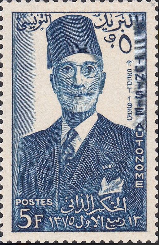 Ce timbre représente Sidi Lamine Pacha Bey (également connu sous le nom de Muhammad VIII al-Amin), qui fut le dernier Bey de Tunisie. il commémore l'Autonomie interne de la Tunisie. L'autonomie interne de la Tunisie, proclamée par Pierre Mendès France le 31 juillet 1954 et officialisée par les conventions du 3 juin 1955, a marqué une étape décisive vers l'indépendance (20 mars 1956)