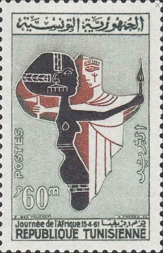 Ce timbre tunisien émis le 15 avril 1961 célèbre la Journée de l’Afrique, un événement qui met à l’honneur l’unité du continent africain ainsi que la solidarité entre les peuples engagés dans les mouvements d’indépendance. À une époque où plusieurs nations africaines accèdent à la souveraineté, cette journée symbolise l’affirmation d’une identité collective et la volonté de construire un avenir fondé sur la coopération, l’émancipation politique et le dépassement du colonialisme. L’illustration — une carte stylisée de l’Afrique associée à des figures humaines et animales — évoque la richesse culturelle du continent, la profondeur de ses traditions et l’importance de la diversité humaine dans la construction d’un projet commun. À travers cette émission, la Tunisie réaffirme son appartenance à la famille africaine et son soutien au mouvement panafricain qui progresse alors sur tout le continent.