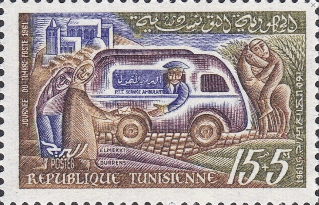 Ce timbre tunisien, émis le 6 mai 1961 pour la Journée du Timbre, met à l’honneur la philatélie en tant que vecteur culturel et mémoire visuelle d’un pays. L’illustration montre une figure stylisée tenant un timbre, tandis que sa robe est ornée de représentations d’autres timbres tunisiens : une manière artistique d’exprimer la richesse patrimoniale que constituent ces petites œuvres imprimées. Cet événement annuel célèbre le rôle du timbre dans la communication, l’histoire et l’identité nationale, rappelant qu’il ne s’agit pas seulement d’un outil postal, mais aussi d’un support artistique et documentaire. En 1961, alors que la Tunisie jeune et indépendante forge sa présence sur la scène internationale, la Journée du Timbre devient un moyen de valoriser sa production graphique, son héritage culturel et l’importance du courrier dans la vie sociale.