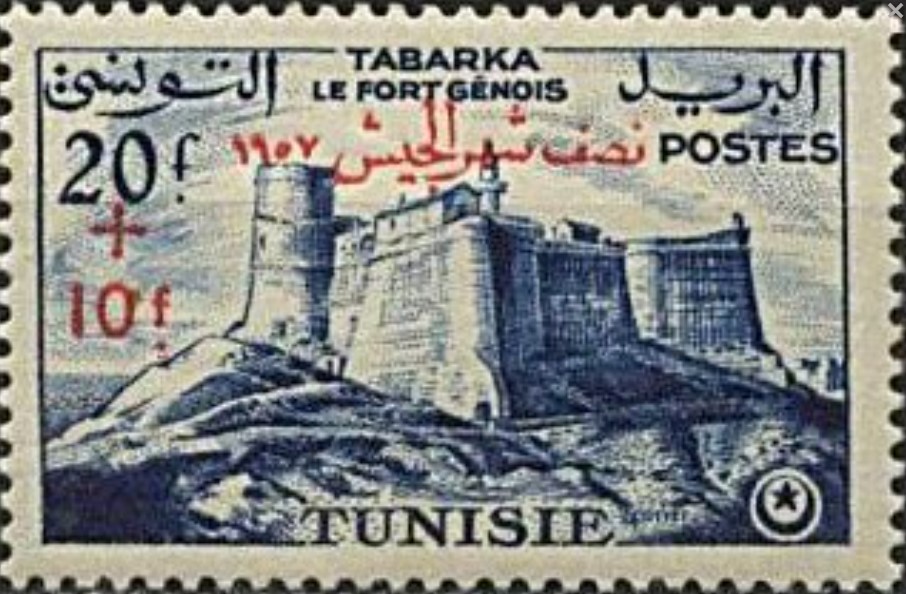 L'inscription en rouge « 1957 نصف شهر الجيش » (Quinzaine de l'Armée 1957) indique qu'il s'agit d'un timbre de bienfaisance émis pour soutenir l'armée tunisienne, peu après l'indépendance du pays en 1956.