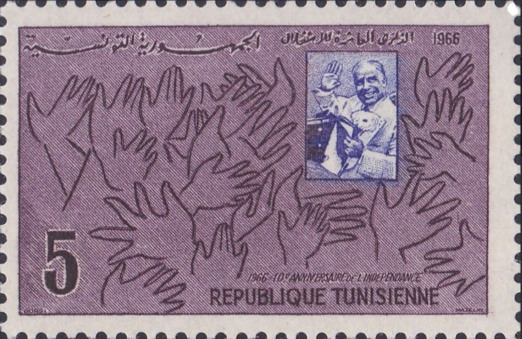 Ce timbre commémore le dixième anniversaire de l’indépendance de la Tunisie, célébré en 1966, en mettant l’accent sur l’élan collectif et la construction nationale qui ont marqué la première décennie de souveraineté du pays. La composition dominée par une multitude de mains stylisées évoque l’union du peuple, la solidarité et la participation de chacun à l’édification de l’État moderne, symbolisant à la fois le travail, l’engagement civique et l’espoir partagé. L’image centrale insérée renvoie à la dimension humaine et sociale de cette période, rappelant les priorités accordées à la famille, au progrès social et à l’avenir des générations dans le projet national. L’ensemble s’inscrit dans un contexte tunisien de consolidation des institutions, de modernisation et d’affirmation de l’identité nationale, où la mémoire de l’indépendance sert de fondement à une vision collective tournée vers le développement et la cohésion du pays.