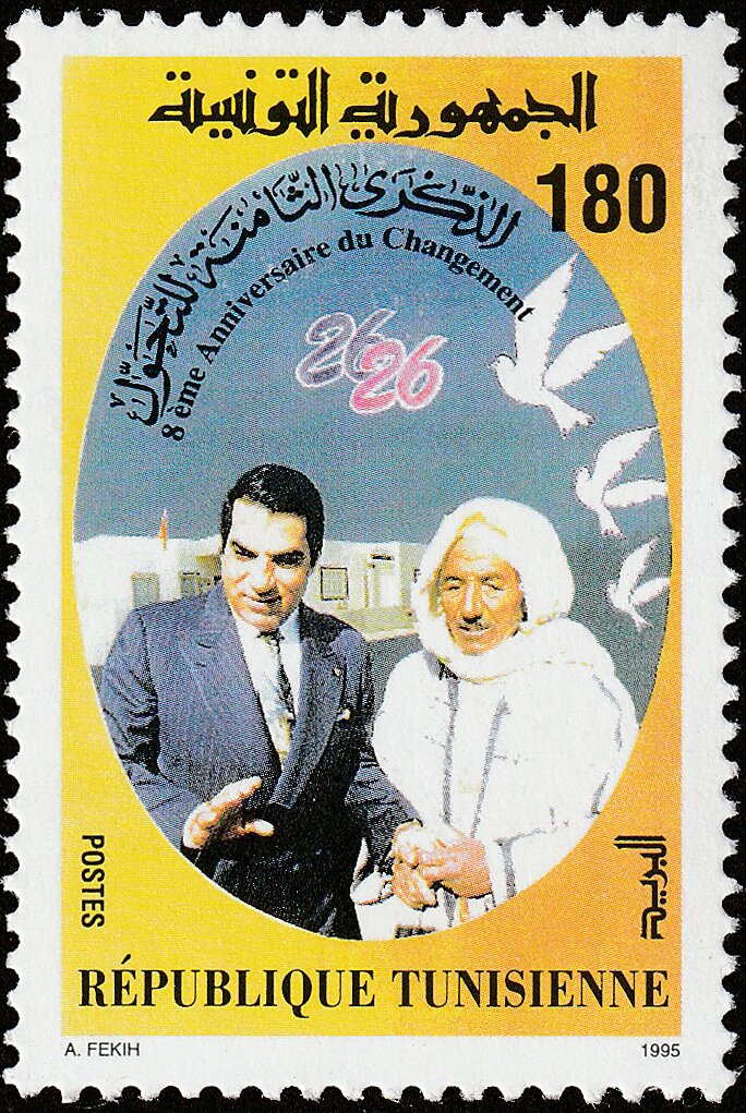 Ce timbre commémore le tournant politique du 7 novembre 1987. L'image centrale montre le président Zine El Abidine Ben Ali aux côtés d'un citoyen âgé vêtu d'un burnous traditionnel blanc, sous un ciel parsemé de colombes.Le visuel met l'accent sur le "Pacte National" et la solidarité entre les générations et les classes sociales. Il cherche à projeter l'image d'un dirigeant proche du peuple et respectueux des traditions rurales tunisiennes, tout en prônant un climat de paix et de stabilité représenté par les colombes.