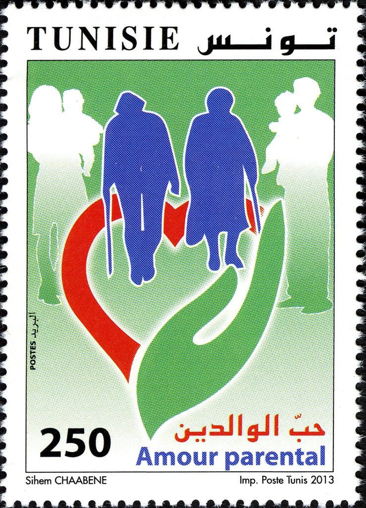 Ce timbre met en avant la solidarité familiale et l’attention portée aux personnes âgées ou dépendantes, à travers une iconographie douce et symbolique où la main protectrice et le cœur expriment le soutien affectif. Les silhouettes suggèrent la transmission, l’entraide et le devoir moral entre générations. Dans le contexte tunisien, le message valorise la famille comme pilier fondamental de la société, espace de protection et de respect, particulièrement dans un cadre culturel où les liens parentaux jouent un rôle central.