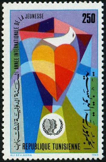 Ce timbre célèbre l’Année internationale de la jeunesse, inscrivant la Tunisie dans une dynamique universelle de reconnaissance du rôle des jeunes dans le développement des sociétés. L’illustration, construite autour de formes colorées et ascendantes, symbolise l’élan, l’espoir et l’ouverture vers l’avenir, tout en suggérant la diversité, la créativité et le potentiel collectif. La présence d’un emblème institutionnel international souligne l’engagement du pays dans les initiatives multilatérales et son adhésion aux valeurs de solidarité, d’éducation et de progrès. Dans le contexte tunisien, ce message fait écho à une jeunesse perçue comme moteur du renouvellement social, culturel et économique, et comme acteur essentiel de la construction nationale et de l’intégration du pays dans le monde moderne.
