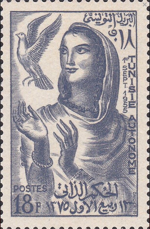 ينتمي هذا الطابع إلى سلسلة تحتفل بالاستقلال الذاتي لتونس، وهي خطوة حاسمة نحو استقلالها التام عن فرنسا. تقدم الصورة رمزية للأمة أو الحرية، ممثلة بامرأة تحمل حمامة السلام، مما يمثل فترة انتقال سياسي كبير للبلاد.