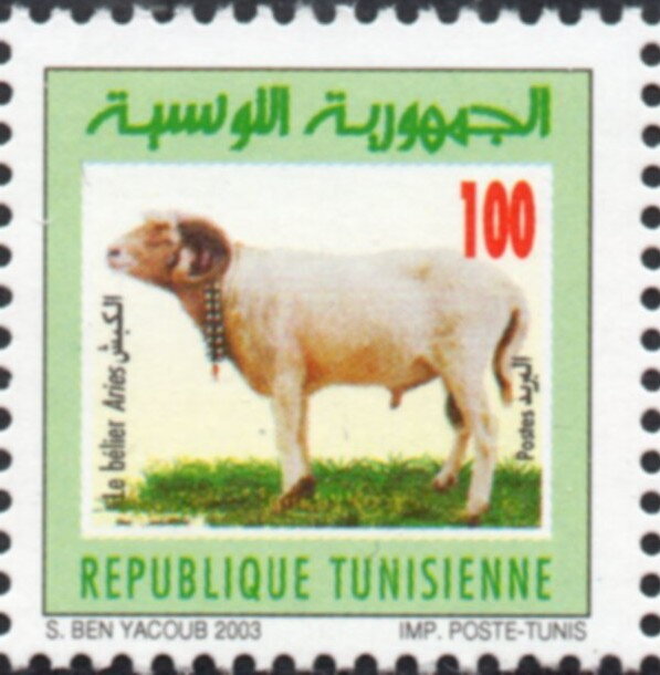 Ce timbre met en avant le bélier (Aries), figure centrale de l'élevage pastoral et symbole de vigueur dans les zones rurales de Tunisie. L'illustration d'un spécimen robuste souligne l'importance économique de l'ovin pour l'agriculture nationale et son rôle sacré lors des célébrations rituelles et familiales, telles que l'Aïd al-Adha. Ce visuel témoigne de l'attachement du pays à ses traditions agropastorales et à la préservation de ses races locales, qui constituent un pilier de la sécurité alimentaire et de l'identité culturelle des campagnes tunisiennes.