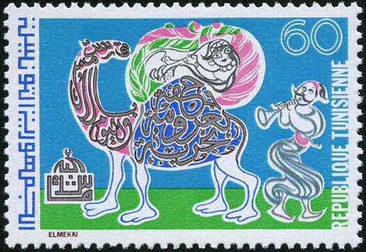 Dans cette composition de 60 millimes, le chameau et le flûtiste sont rendus à travers des courbes calligraphiques entrelacées, évoquant l'harmonie des traditions nomades et sahariennes. Ce choix artistique souligne le lien organique entre la langue, le paysage et les rituels de la vie rurale, où la musique et le voyage sont indissociables de la mémoire collective. En élevant ces symboles populaires au rang de calligraphie figurative, la Tunisie valorise son patrimoine saharien comme un élément central de son raffinement esthétique. Ce timbre agit comme un hommage à la sérénité des espaces ouverts, faisant de la lettre un pinceau qui dessine l'âme du territoire.