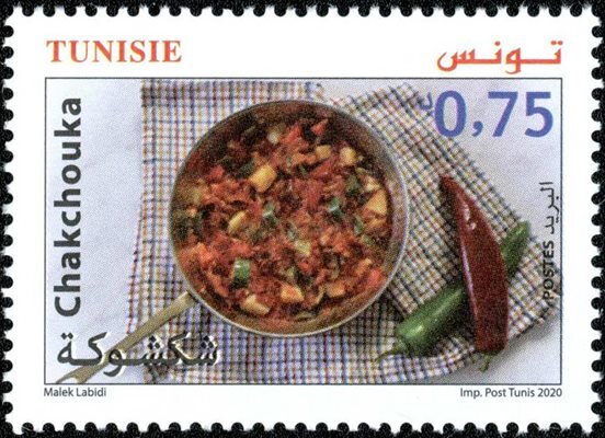 Ce timbre met à l'honneur la gastronomie tunisienne à travers la « Chakchouka », plat populaire et emblématique à base de tomates, de poivrons et d'œufs. Le visuel présente une poêle garnie de ce mets coloré, flanquée de piments frais, rappelant les saveurs ensoleillées et épicées de la table tunisienne. En inscrivant ce plat au catalogue philatélique, la Tunisie valorise son patrimoine immatériel et culinaire, symbole de convivialité et de simplicité. C'est une célébration de l'identité culturelle à travers l'art de vivre et les traditions culinaires qui lient les Tunisiens à leur terre et à leurs produits locaux.