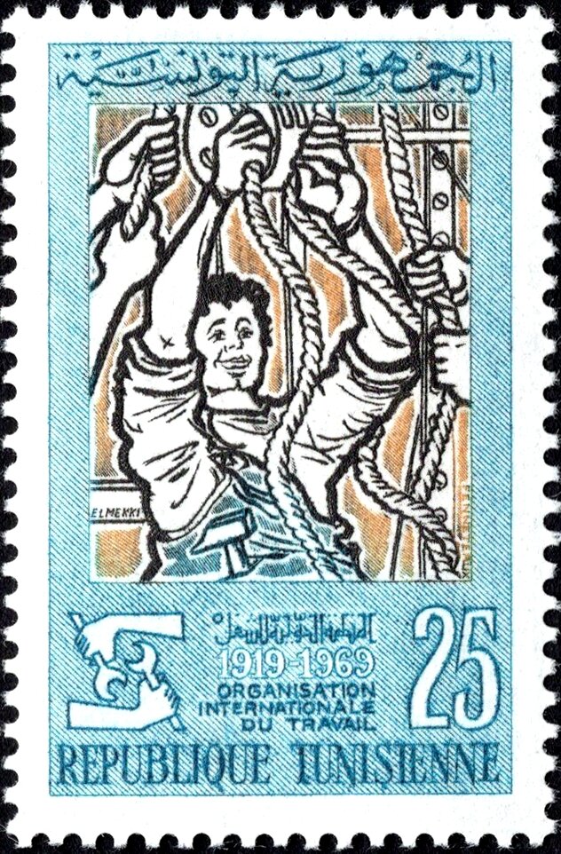 Ce timbre commémore le cinquantième anniversaire de l’Organisation internationale du Travail (OIT), célébré en 1969, et marque l'engagement de la Tunisie envers les standards internationaux de justice sociale et de travail décent. L’illustration met en scène l’effort physique et collectif à travers un ouvrier entouré de cordes et de mécanismes de levage, symbolisant la participation active de la main-d’œuvre à la construction de l’économie moderne. Cette émission souligne l'importance de la coopération entre les travailleurs et les institutions pour garantir le progrès social au sein de la jeune République tunisienne.