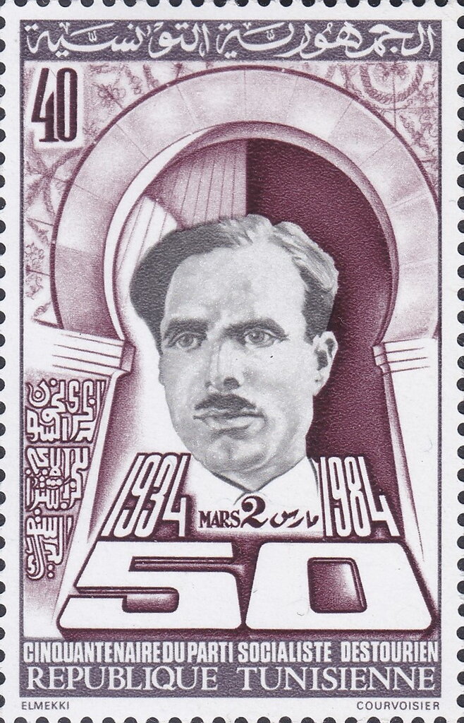 Cette émission commémore le 50e anniversaire de la création du Néo-Destour (devenu Parti Socialiste Destourien), fondé le 2 mars 1934 à Ksar Hellal. L'illustration présente le portrait de Habib Bourguiba, leader historique et premier président de la République Tunisienne, encadré par une arcade traditionnelle évoquant l'architecture locale. Le chiffre « 50 » massif à la base du timbre souligne la pérennité de l'institution politique qui a mené la Tunisie vers l'indépendance. C'est un hommage à la lutte nationale et à la construction de l'État moderne.