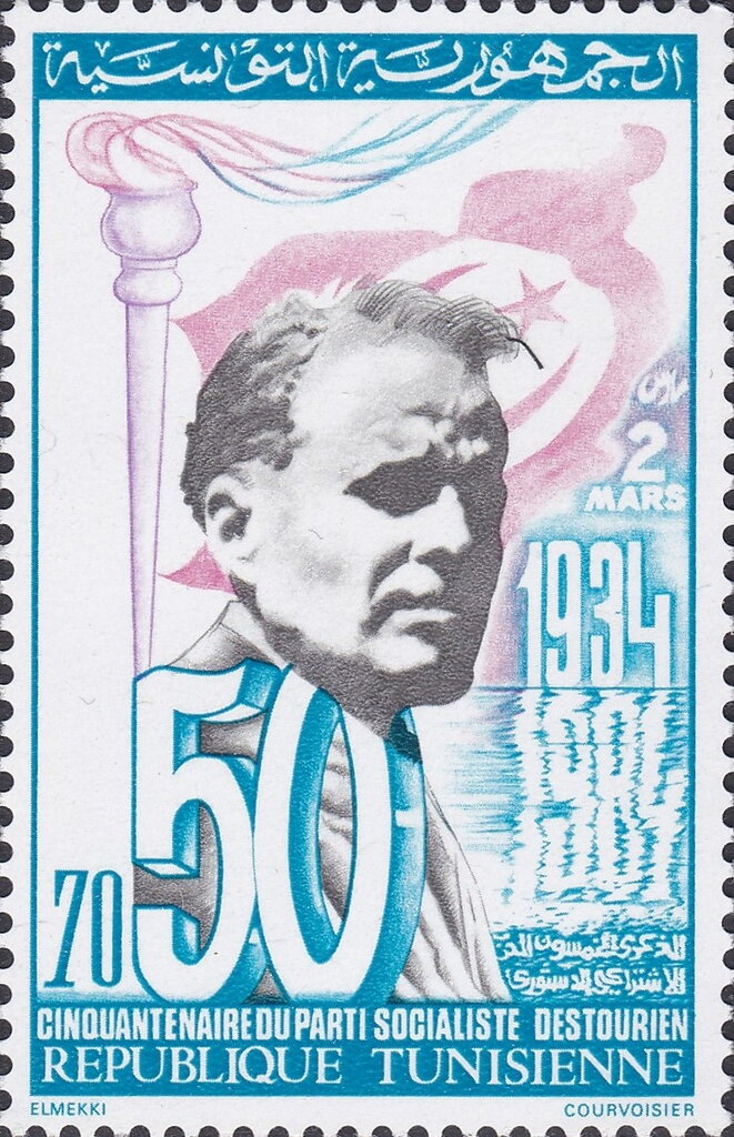 Cette émission commémore le 50e anniversaire de la création du Néo-Destour (devenu Parti Socialiste Destourien), fondé le 2 mars 1934 à Ksar Hellal. L'illustration présente le portrait de Habib Bourguiba, leader historique et premier président de la République Tunisienne, encadré par une arcade traditionnelle évoquant l'architecture locale. Le chiffre « 50 » massif à la base du timbre souligne la pérennité de l'institution politique qui a mené la Tunisie vers l'indépendance. C'est un hommage à la lutte nationale et à la construction de l'État moderne.