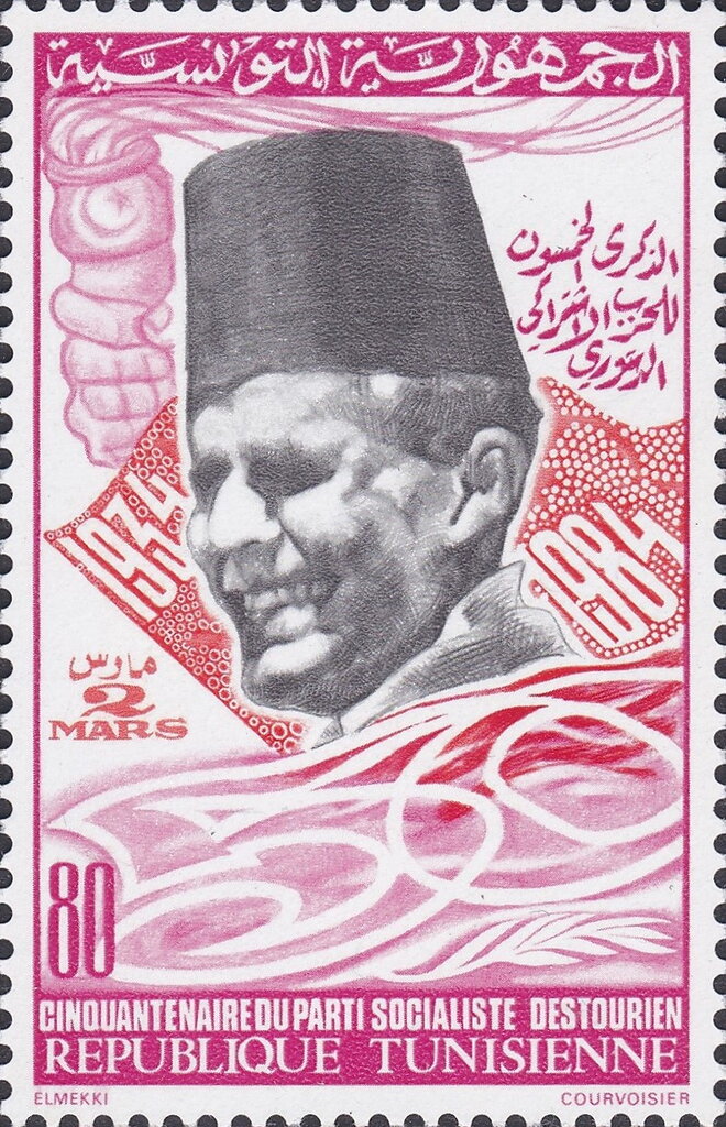 Cette émission commémore le 50e anniversaire de la création du Néo-Destour (devenu Parti Socialiste Destourien), fondé le 2 mars 1934 à Ksar Hellal. L'illustration présente le portrait de Habib Bourguiba, leader historique et premier président de la République Tunisienne, encadré par une arcade traditionnelle évoquant l'architecture locale. Le chiffre « 50 » massif à la base du timbre souligne la pérennité de l'institution politique qui a mené la Tunisie vers l'indépendance. C'est un hommage à la lutte nationale et à la construction de l'État moderne.