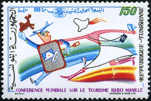 Émis à l'occasion d'une rencontre internationale majeure, ce timbre utilise un style caricatural et dynamique pour représenter le voyageur moderne. On y voit un touriste bondissant, chargé de bagages et d'appareils photo, survolant des paysages stylisés. Ce message souligne l'importance stratégique du secteur touristique pour l'économie tunisienne, considéré comme un vecteur de rencontre entre les peuples et de développement mondial. À travers cette illustration joyeuse, la Tunisie s'affirme comme une destination d'accueil ouverte sur le monde, prête à relever les défis de l'industrie du voyage et de la coopération internationale.