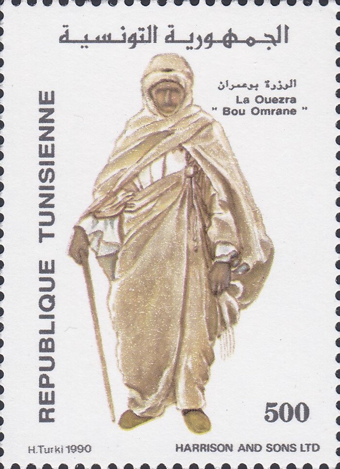 Ce timbre met à l’honneur un costume traditionnel emblématique des régions sahariennes et présahariennes de Tunisie, associé à la vie nomade et aux environnements arides du sud. L’illustration valorise une tenue fonctionnelle et symbolique, conçue pour protéger du climat tout en exprimant une identité sociale et culturelle profondément enracinée dans les modes de vie pastoraux. À travers cette représentation, l’émission souligne l’ingéniosité des sociétés locales face aux contraintes naturelles et rappelle l’importance du vêtement comme marqueur de patrimoine immatériel, porteur de traditions, de savoir‑faire et d’adaptation au territoire tunisien.