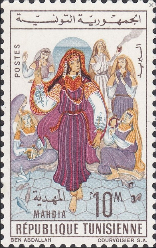 Ce timbre célèbre le raffinement exceptionnel du patrimoine vestimentaire de Mahdia, ancienne capitale fatimide reconnue pour ses traditions d'excellence en tissage de soie et en broderie au fil d'or. L'illustration, signée par l'artiste Jalal Ben Abdallah, met en scène un groupe de femmes parées de leurs costumes cérémoniels, mettant en lumière la complexité des parures et le rôle central de la femme dans la transmission des rituels et de l'élégance locale. La présence discrète de la mer à l'arrière-plan ancre la scène dans le contexte géographique de cette cité côtière, tandis que la richesse des motifs représentés symbolise la vitalité de l'artisanat tunisien. À travers cette émission, la République valorise son héritage artisanal comme un pilier de l'identité nationale, transformant le costume traditionnel en un véritable témoin historique de la splendeur et du savoir-faire séculaire des communautés de la côte tunisienne.