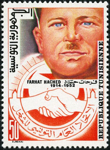 Ce timbre de 50 millimes rend hommage à Farhat Hached (1914-1952), fondateur de l'Union Générale Tunisienne du Travail (UGTT) et figure emblématique du mouvement national. Assassiné par la Main Rouge (organisation terroriste liée au protectorat), Hached incarne le lien indissociable entre la revendication des droits des travailleurs et le combat pour la souveraineté nationale. Le graphisme de Hatem El Mekki, centré sur le logo de l'UGTT (deux mains serrées), souligne la solidarité ouvrière comme socle de la résistance. En consacrant cette figurine à ce martyr, la République sanctuarise le syndicalisme comme un acteur majeur de l'histoire politique et de la justice sociale du pays.