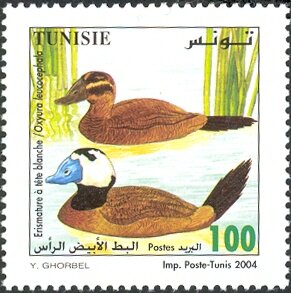 Ce timbre met en valeur l’Érismature à tête blanche (Oxyura leucocephala), un canard plongeur rare et emblématique des zones humides méditerranéennes. L'illustration présente le dimorphisme sexuel de l'espèce, avec le mâle au bec bleu vif caractéristique, soulignant l'importance écologique de sites tunisiens comme le lac d'Ichkeul pour la nidification de cette espèce mondialement menacée. À travers cette émission, la Tunisie réaffirme son engagement pour la préservation de la biodiversité aquatique et la protection des écosystèmes fragiles qui servent de refuges vitaux à la faune migratrice et sédentaire.