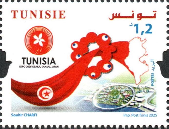 Ce timbre célèbre la participation de la Tunisie à l'Exposition Universelle d'Osaka 2025 au Japon, soulignant l'ouverture du pays sur l'innovation mondiale et les enjeux du futur. L'illustration harmonise le drapeau national et la carte de la Tunisie avec le logo de l'exposition et une vue aérienne du site circulaire du Kansai, symbolisant la connectivité, le dynamisme et le message de progrès porté par la nation à l'échelle internationale. À travers cette émission, les institutions tunisiennes réaffirment leur volonté de renforcer les partenariats technologiques et culturels mondiaux pour un développement humain durable.