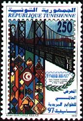 Ce timbre commémore la participation de la Tunisie à l'exposition philatélique mondiale PACIFIC 97 organisée à San Francisco. Le design d'Insaf Guezguez Jellazi est très graphique : il juxtapose le célèbre Golden Gate Bridge à une mosaïque de motifs traditionnels tunisiens (drapeau, architecture de Sidi Bou Saïd, tapis).