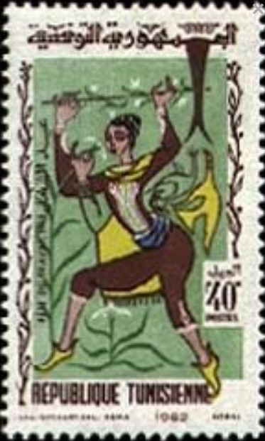 Ce timbre célèbre la Fête des Fleurs de l'Ariana, une manifestation emblématique mettant à l'honneur le patrimoine horticole de cette ville tunisienne historiquement surnommée la « Cité des Roses ». L'illustration, d'un style graphique vif et moderne, met en scène une figure allégorique tenant un rameau fleuri, symbolisant la joie, la renaissance printanière et la fertilité de la terre. Dans le contexte de la jeune République de 1962, cette émission souligne la volonté de valoriser les traditions régionales et l'art de vivre local comme des piliers de l'identité nationale. En mettant en avant l'horticulture et le rayonnement culturel de l'Ariana, le message porté est celui d'une Tunisie en pleine floraison, harmonisant son héritage naturel avec une vitalité sociale et touristique renouvelée.