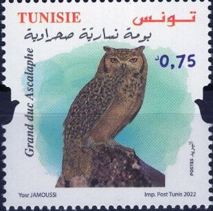 يُظهر هذا الطابع طائر النسر البومة الأسكالاف، وهو طائر ليلي من الفرائس يرمز إلى المناطق القاحلة وشبه الصحراوية في جنوب تونس. يرمز وضعه الرواقي على صخرة إلى الحكمة واليقظة والتكيف الرائع للحيوانات التونسية مع الظروف المناخية القاسية في الصحراء. ومن خلال تسليط الضوء على حارس الليل هذا، يسلط البث البريدي الضوء على التنوع البيولوجي لمناطق ما قبل الصحراء الكبرى وأهمية الحفاظ على الموائل الطبيعية للأنواع البرية التي تشكل المناظر الطبيعية والهوية الطبيعية للمنطقة.