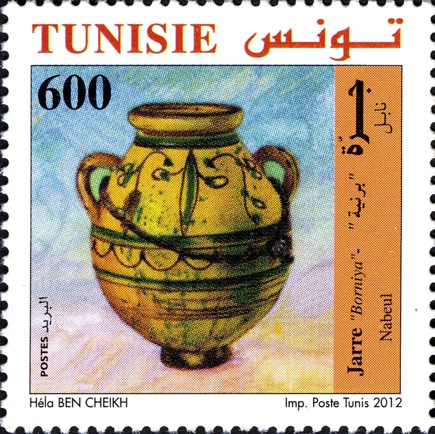 Ce timbre met en valeur une jarre traditionnelle issue du patrimoine céramique de Nabeul, région emblématique de la poterie tunisienne, reconnue pour la continuité de ses savoir‑faire artisanaux. L’illustration souligne la fonction domestique et culturelle de la jarre, objet central de la vie quotidienne utilisé pour le stockage et la conservation, mais aussi support d’un décor symbolique transmis par la tradition. Le message met en lumière l’équilibre entre utilité et esthétique dans l’artisanat tunisien, tout en rappelant le rôle de Nabeul comme pôle historique de création céramique, où l’identité locale se lit à travers les formes, les motifs et la relation étroite entre l’objet et les usages sociaux.