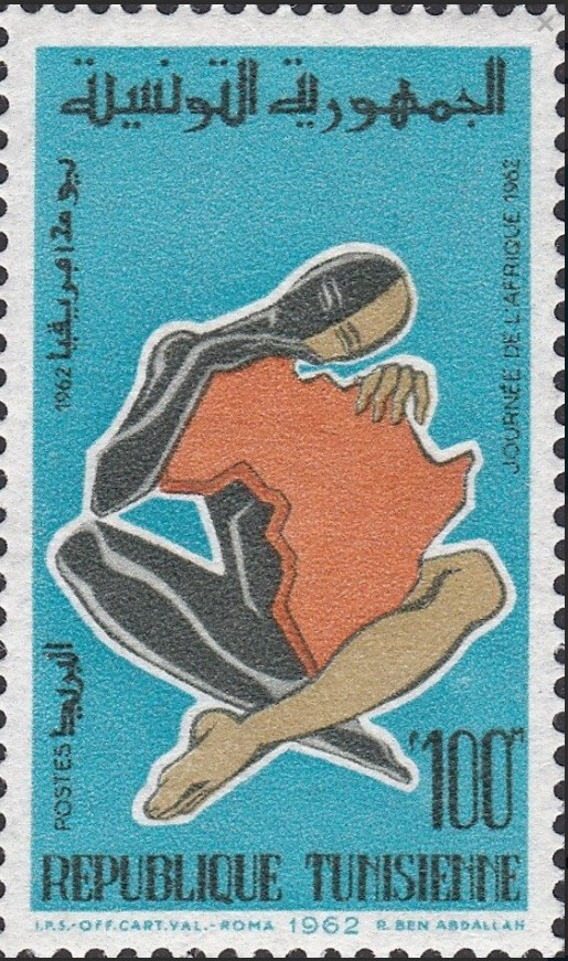 Ce timbre, émis pour célébrer la « Journée de l'Afrique » en 1962, illustre l'engagement précurseur de la Tunisie en faveur du panafricanisme et de la solidarité entre les nations du continent en pleine période de décolonisation. La composition graphique, qui fusionne habilement un portrait humain avec la silhouette géographique de l'Afrique, porte un message puissant d'unité et d'identité partagée, suggérant que l'âme du continent réside avant tout dans ses peuples. Dans le contexte tunisien de l'époque, cette émission souligne la volonté de la jeune République de s'affirmer comme un trait d'union entre le Maghreb et l'Afrique subsaharienne, tout en célébrant l'éveil d'une conscience collective et la conquête des souverainetés nationales. C'est un hommage visuel à la fraternité continentale, ancrant l'histoire de la Tunisie dans une destinée africaine commune portée par l'espoir et le renouveau des années 1960.