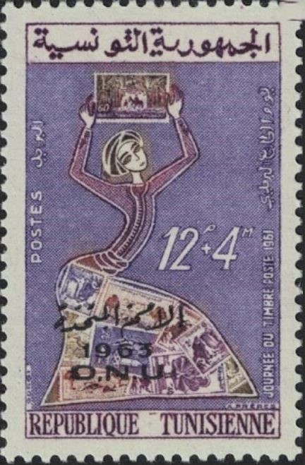 Ce timbre célèbre la Journée du Timbre, une institution de la culture postale visant à valoriser le rôle du courrier et de la philatélie dans la société.La surcharge « O.N.U. 1963 » apposée sur cette émission de 1961 souligne l'ancrage de la Tunisie dans la communauté internationale et son attachement aux valeurs de communication universelle. Ce sujet reflète une période où la jeune République utilisait le support postal pour construire son image, faisant de chaque figurine un témoin de son patrimoine, de son identité et de sa participation active au dialogue entre les peuples.