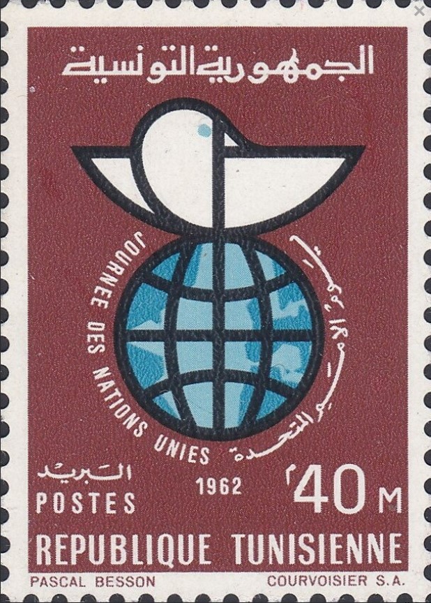 Ce timbre, émis pour célébrer la Journée des Nations Unies en 1962, souligne l'engagement diplomatique et l'ancrage international de la jeune République tunisienne quelques années après son accession à la souveraineté.