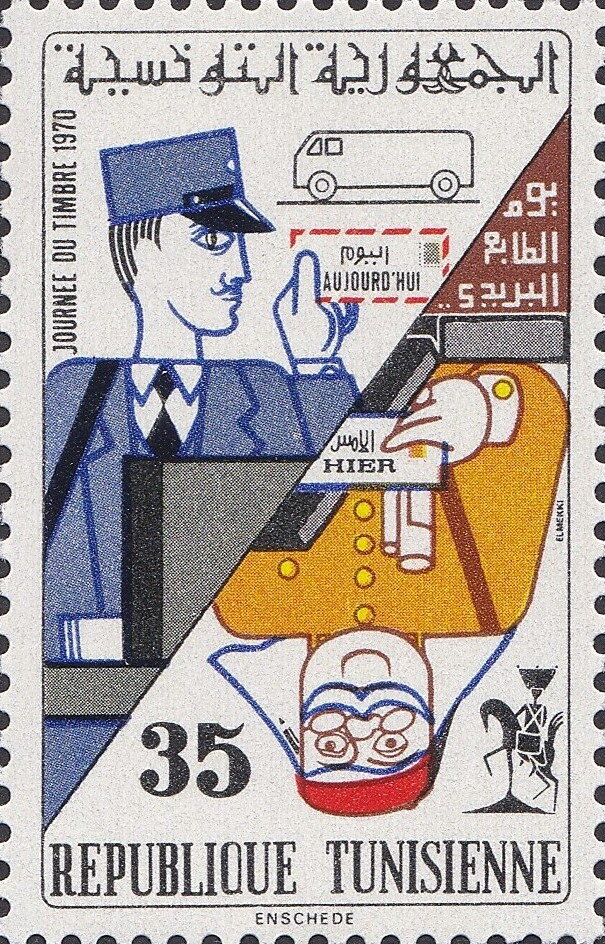 Ce timbre commémore la Journée du Timbre 1970, un événement annuel majeur qui célèbre le rôle de la poste comme vecteur de lien social et de rayonnement culturel en Tunisie.En transformant le support postal en une pièce d'art contemporain, la République souligne sa volonté d'allier tradition et modernité, faisant de chaque courrier un petit ambassadeur de la créativité nationale.