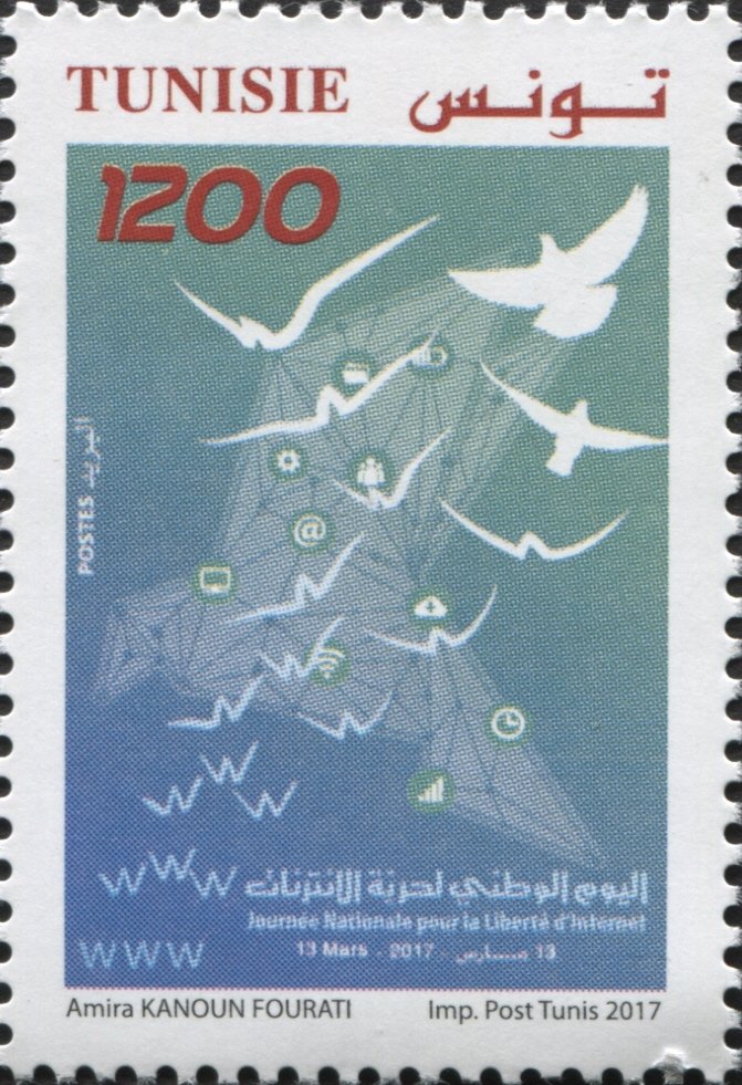 Dans le cadre de la même série sur la Liberté d’Internet, ce timbre utilise une composition graphique symbolique d'Amira Kanoun Fourati montrant des oiseaux blancs s'envolant d'un maillage numérique parsemé d'icônes technologiques (@, wifi, etc.). La transformation des "WWW" en oiseaux migrateurs évoque l'émancipation par le savoir et la libre circulation de l'information par-delà les frontières. Ce timbre affirme la volonté de la Tunisie moderne de garantir à ses citoyens un accès universel et non censuré à la toile, outil indispensable de citoyenneté, d'innovation et de progrès social au XXIe siècle.