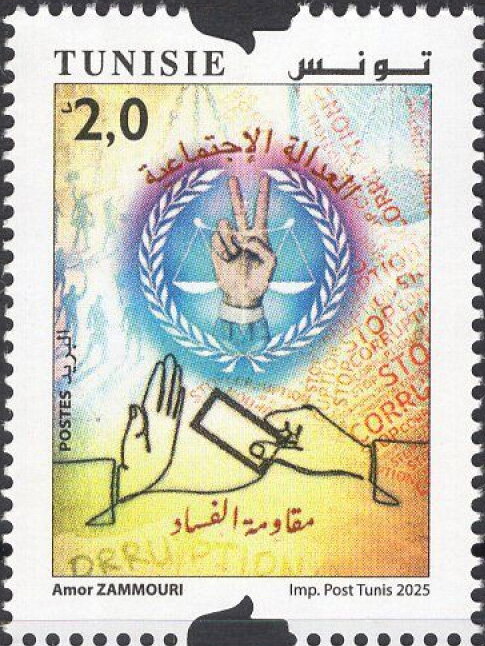 Ce timbre illustre l'engagement de l'État tunisien en faveur de la transparence et de l'équité à travers la lutte contre la corruption et la promotion de la justice sociale. L'illustration, mettant en scène une main refusant une transaction illicite sous l'égide de la balance de la justice et du signe de la victoire, symbolise la primauté de la loi et la volonté citoyenne de bâtir des institutions intègres. Cette émission de 2025 souligne que l'intégrité administrative et la répartition juste des ressources sont les piliers fondamentaux de la stabilité sociale et du renouveau démocratique en Tunisie.