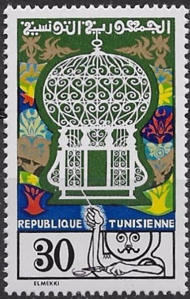 Ce timbre met en valeur le patrimoine artisanal et culturel de la Tunisie à travers la représentation d’objets traditionnels emblématiques, soulignant la continuité entre les savoir-faire anciens et l’identité nationale moderne. L’illustration associe une pièce de céramique ou de métal finement travaillée à un motif décoratif circulaire richement ornementé, évoquant l’esthétique des arts décoratifs tunisiens hérités des civilisations successives ayant marqué le pays, de l’Antiquité aux influences arabo-islamiques. Le décor rayonnant et la précision des motifs symbolisent l’harmonie, la maîtrise technique et le sens de l’équilibre propres à l’artisanat local, tandis que la composition globale suggère la transmission du geste, de la tradition et de la mémoire collective. Dans le contexte tunisien, ce timbre s’inscrit dans une démarche de valorisation du patrimoine matériel, rappelant le rôle central des métiers d’art dans l’économie traditionnelle, la vie quotidienne et l’expression culturelle. Il affirme ainsi l’importance de préserver et de promouvoir ces formes d’expression artistique comme fondement de l’identité nationale et comme lien vivant entre passé historique, créativité populaire et reconnaissance institutionnelle.