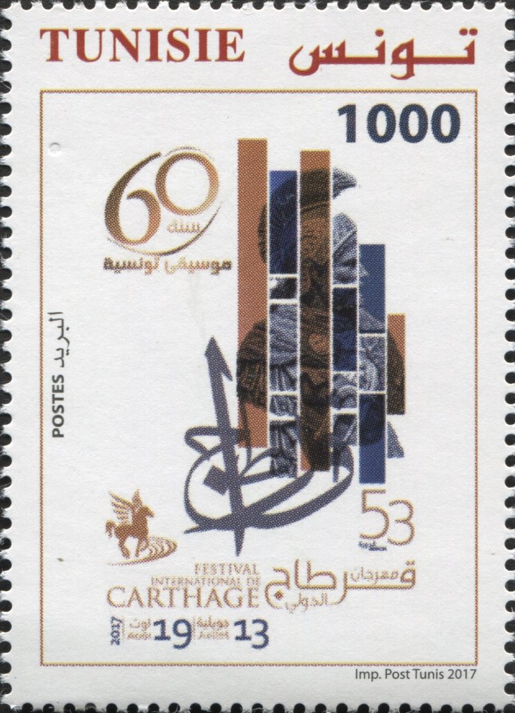 Ce timbre célèbre la 53ème édition du Festival International de Carthage, l'un des événements culturels les plus prestigieux du monde arabe et de l'Afrique. La composition graphique moderne intègre des symboles de l'histoire carthaginoise (le cavalier ailé, les colonnes antiques) superposés à des formes évoquant la musique et la scène. Le message porté par cette émission souligne le rôle de Carthage comme carrefour des arts et des civilisations, où le patrimoine bimillénaire rencontre les expressions artistiques les plus contemporaines pour promouvoir le dialogue entre les peuples.