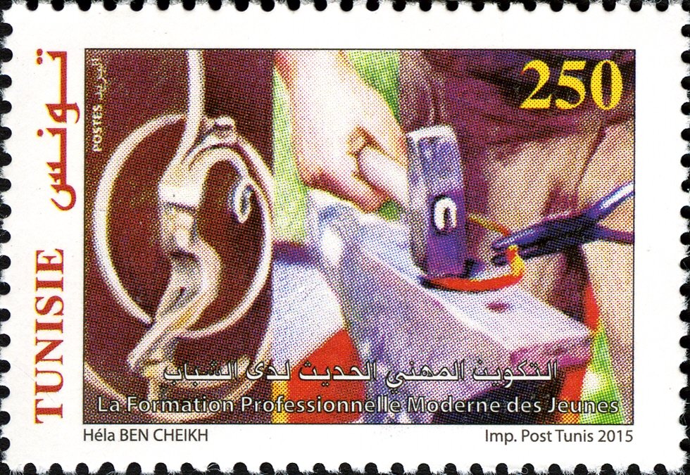 Consacré à la « Formation professionnelle moderne des jeunes », ce timbre illustre l'engagement de la Tunisie envers l'apprentissage technique et l'insertion des nouvelles générations dans le tissu économique. La composition montre une main maniant un marteau sur une enclume, symbolisant la maîtrise du geste et la transmission des savoir-faire industriels ou artisanaux. L'image véhicule un message d'espoir et de progrès social, affirmant que la qualification technique est un moteur essentiel de développement et de dignité pour la jeunesse tunisienne dans un monde en constante mutation technologique.