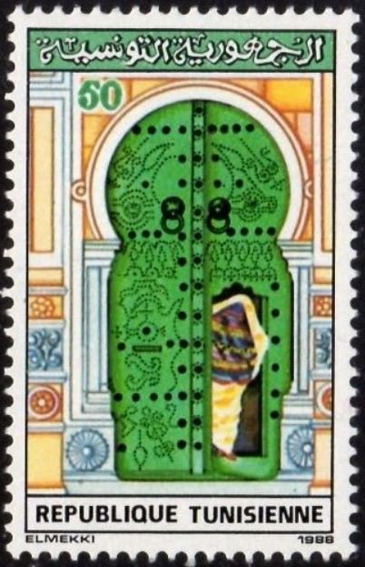 Ce timbre illustre l'élégance du village de Sidi Bou Saïd à travers l'une de ses portes emblématiques. Peinte en vert, couleur hautement symbolique dans la culture arabo-musulmane, elle est ornée de motifs complexes réalisés par cloutage noir, représentant des cyprès et des symboles protecteurs. La présence d'une silhouette drapée d'un « safsari » blanc franchissant le portillon souligne l'intimité domestique et la préservation des coutumes citadines. Cette émission célèbre l'esthétique unique de l'architecture méditerranéenne tunisienne, où le fer forgé et le cloutage transforment une simple entrée en un chef-d'œuvre artistique.