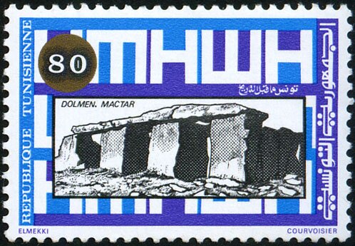 Ce timbre illustre le patrimoine mégalithique de la Tunisie à travers un dolmen du site archéologique de Mactar. Ces monuments funéraires en pierre massive, datant de la fin de la préhistoire, reflètent les croyances et l'organisation sociale des populations berbères autochtones. En présentant cette structure robuste sur un fond graphique composé de lettres stylisées, l'émission fait le pont entre les architectures primitives et l'identité moderne. C'est un hommage à la persistance du sacré et à la force des bâtisseurs antiques qui ont marqué durablement les paysages des hautes terres tunisiennes.