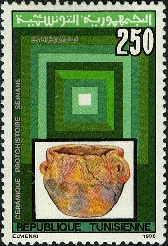 Ce timbre célèbre les origines millénaires de l'artisanat potier en Tunisie à travers un vase protohistorique provenant de la région de Sejnane. L'illustration met en valeur la forme rustique et les motifs géométriques incisés, caractéristiques d'un savoir-faire qui s'est transmis quasiment sans changement jusqu'à nos jours chez les femmes potières de la région (patrimoine de l'UNESCO). Disposé sur un fond de carrés verts concentriques, le timbre souligne la continuité historique de l'identité artisanale tunisienne. Il témoigne de la survie d'une tradition technique et esthétique qui lie directement les populations actuelles à leurs ancêtres du premier millénaire avant J.-C.
