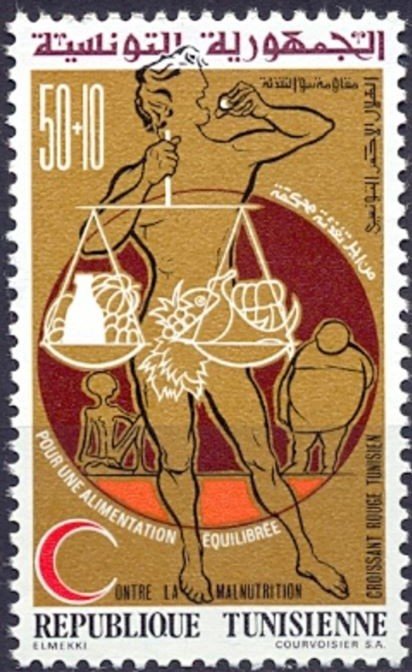 Ce timbre s’inscrit dans une campagne à forte portée humanitaire et sociale, centrée sur la lutte contre la malnutrition et la promotion d’une alimentation équilibrée, thème majeur des politiques de santé publique en Tunisie au cours de la période républicaine. L’illustration repose sur une symbolique explicite : la balance chargée de produits alimentaires évoque l’équilibre nutritionnel, la juste répartition des ressources et la nécessité d’harmoniser les apports pour assurer la santé collective, tandis que la présence du croissant renvoie à l’engagement humanitaire et solidaire porté par le Croissant‑Rouge tunisien. La composition associe force physique, nourriture et justice sociale pour souligner que la santé n’est pas seulement une question individuelle, mais un enjeu national lié à l’éducation, à la prévention et à la solidarité. Dans le contexte tunisien, ce timbre reflète les efforts de l’État et des institutions sociales pour améliorer les conditions de vie, combattre les carences alimentaires et sensibiliser la population aux enjeux de nutrition, notamment dans un pays confronté à des disparités régionales et économiques. Il véhicule ainsi un message de responsabilité collective, affirmant que le progrès national passe par la protection des plus vulnérables et par une politique de santé fondée sur l’équilibre, la solidarité et la dignité humaine.