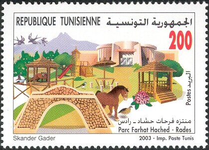 Ce timbre met en avant le Parc Farhat Hached à Radès, illustrant la politique de développement des espaces verts et de loisirs périurbains. Le visuel, de style naïf et coloré, présente des infrastructures de jeux, un pont de pierre et la présence d'animaux, symbolisant un lieu de rencontre entre la nature et les familles. En associant cet espace au nom du leader syndical Farhat Hached, le timbre renforce le lien entre la mémoire historique nationale et le bien-être contemporain des citoyens, tout en promouvant l'éducation environnementale dès le plus jeune âge.