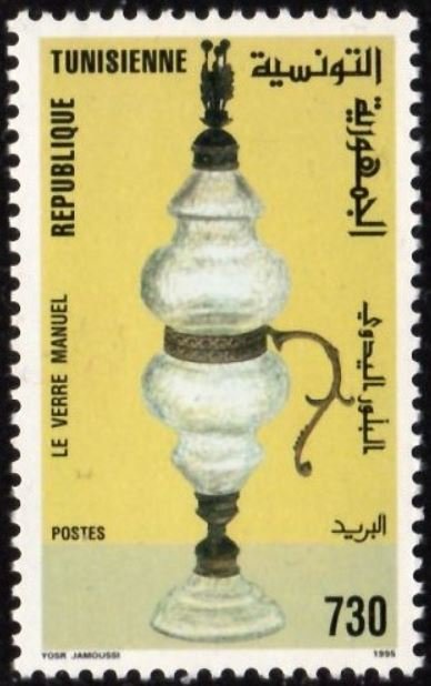Complétant la série sur l'artisanat verrier, ce timbre présente une carafe à double renflement, ornée d'une anse en métal ciselé. Le design met l'accent sur la transparence et la pureté du matériau. L'association du verre et du métal témoigne de la rencontre des savoir-faire (verrerie et ferronnerie d'art). Ces objets, autrefois utilitaires, sont aujourd'hui des pièces de collection qui décorent les intérieurs tunisiens, rappelant l'élégance et le raffinement de l'esthétique méditerranéenne.