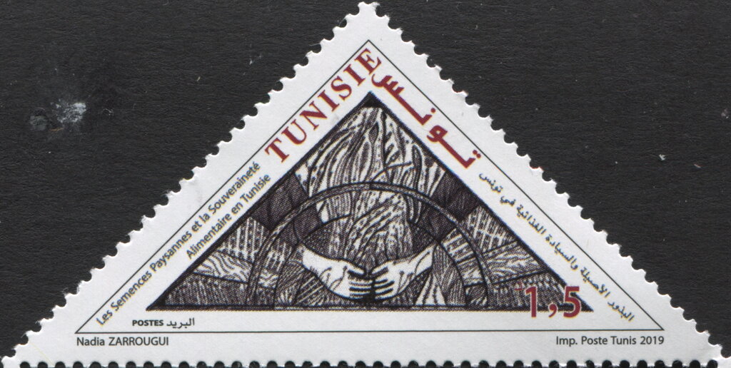 Complétant la thématique de la souveraineté alimentaire, ce second timbre triangulaire adopte un style graphique plus symbolique, avec des mains jointes protégeant des épis de blé sous une voûte architecturale. Ce visuel souligne la dimension sacrée et collective de la terre, ainsi que la responsabilité de protéger les ressources naturelles contre l'uniformisation industrielle. L'émission réaffirme le lien indéfectible entre l'identité rurale tunisienne et la préservation de la biodiversité cultivée, présentant les semences paysannes comme un trésor national à transmettre aux générations futures.