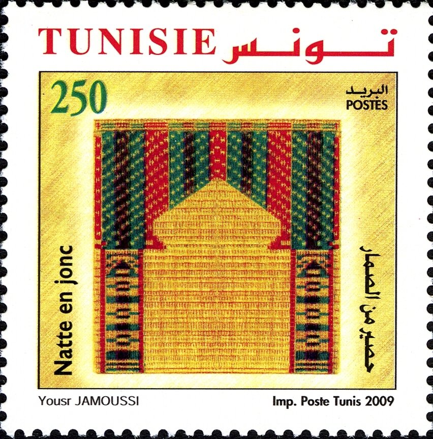 Ce timbre met en valeur une « Natte en jonc » (H'sir), fleuron de l'artisanat traditionnel de Nabeul. L'illustration montre un tapis aux motifs géométriques rythmés de rouge, vert et noir, intégrant souvent une niche de prière (mihrab) dans sa composition. Fabriquées à partir de joncs récoltés localement et teintés, ces nattes sont indissociables de l'esthétique des mosquées et des demeures traditionnelles tunisiennes. En valorisant ce savoir-faire manuel ancestral, la Tunisie célèbre la patience des artisans vanniers et la persistance d'un art populaire authentique qui allie simplicité des matériaux et raffinement décoratif.