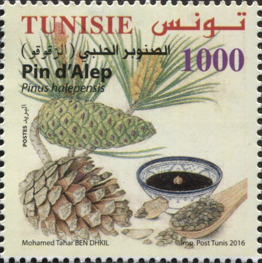 Ce timbre complète la mise en valeur du Pin d'Alep en illustrant son usage culinaire emblématique à travers la préparation de l'Assidat Zgougou. L'image montre les graines noires du pin (zgougou) recueillies dans un bol, prêtes à être transformées en cette crème onctueuse consommée traditionnellement lors du Mouled (naissance du Prophète). Cette émission célèbre une tradition socioculturelle unique à la Tunisie, où les ressources de la forêt se transforment en un symbole de partage et de fête religieuse.