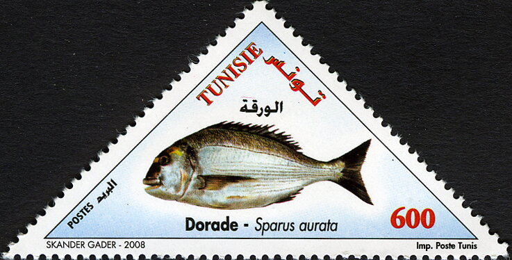 Ce visuel est dédié à la Dorade royale (Sparus aurata), surnommée « l'Orate » en raison de la bande dorée entre ses yeux. Poisson noble par excellence des côtes tunisiennes, la dorade occupe une place de choix sur les tables de fête et dans les restaurants du littoral. Ce timbre illustre non seulement la biodiversité des fonds marins sableux et herbeux de la Tunisie, mais aussi le développement important du secteur de l'aquaculture marine dans des régions comme Monastir, contribuant ainsi à la sécurité alimentaire et au rayonnement des produits de la mer tunisiens à l'étranger.