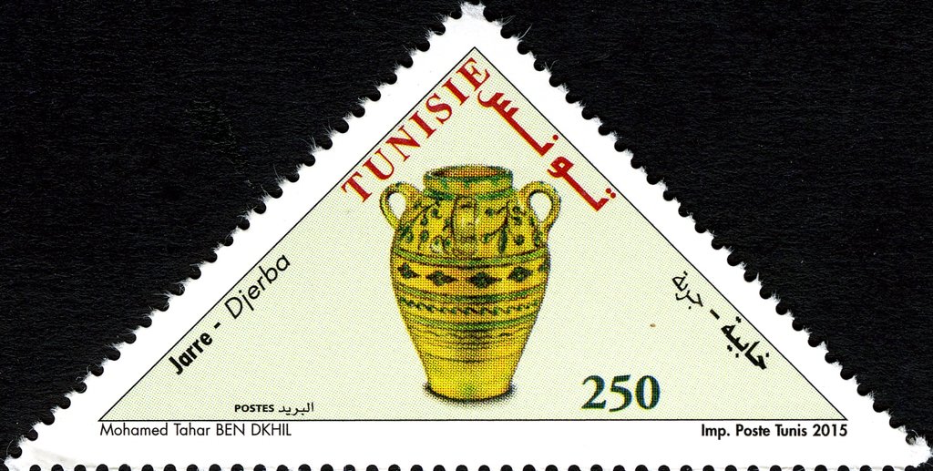 Ce timbre met en avant une jarre de Djerba, pièce maîtresse de la poterie de Guellala, village insulaire célèbre pour ses traditions de tournage millénaires. L'illustration souligne l'esthétique sobre et fonctionnelle de cet objet, souvent utilisé pour la conservation de l'huile d'olive ou des denrées sèches, décoré de motifs géométriques simples en ocre et vert. Le message porté est celui d'une identité artisanale djerbienne ancrée dans le sol, où le savoir-faire des maîtres potiers continue de perpétuer un héritage punique et berbère indispensable à la vie domestique et à l'économie locale.