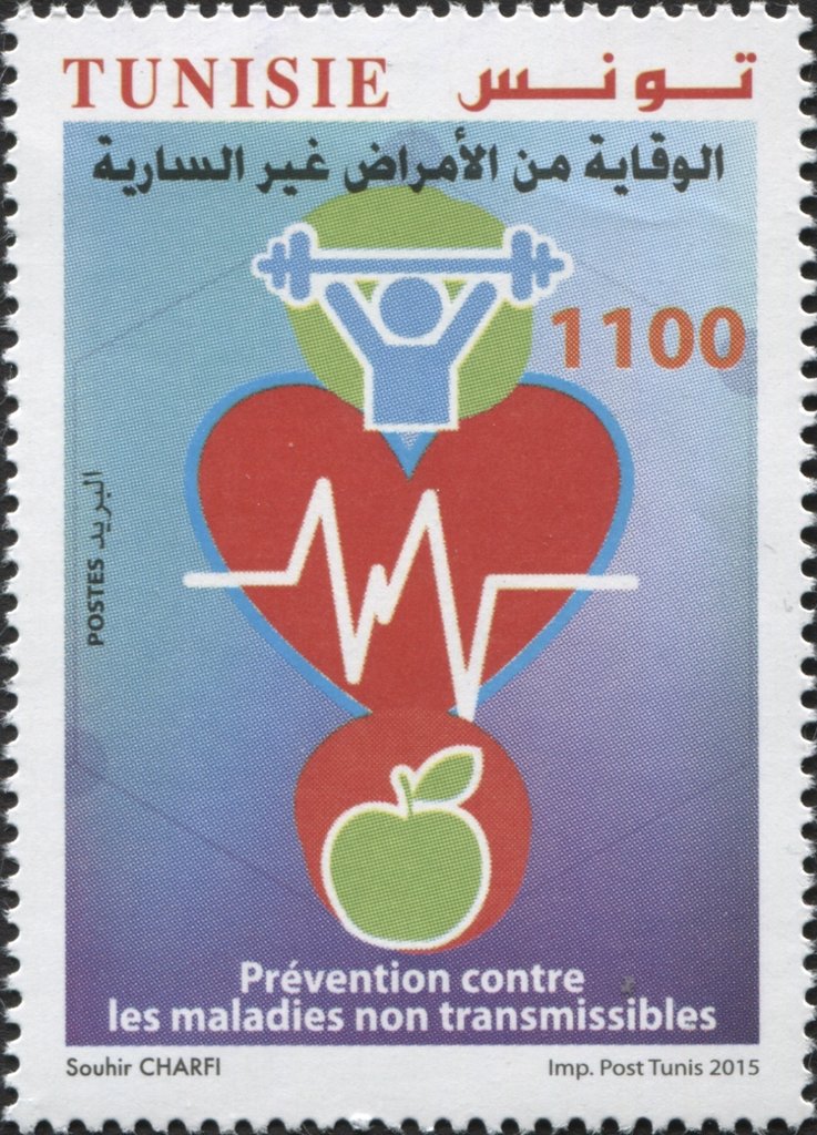 Ce timbre à visée sociale traite de la « Prévention contre les maladies non transmissibles », une priorité de santé publique en Tunisie. La composition graphique de Souhir Charfi utilise des pictogrammes universels — un cœur pour la santé cardiovasculaire, une pomme pour l'alimentation équilibrée et une silhouette soulevant des haltères pour l'activité physique. Le message porté est celui de la promotion d'un mode de vie sain et responsable, rappelant que l'avenir et la prospérité du pays reposent sur la vitalité de ses citoyens et la lutte contre les fléaux de la vie moderne.