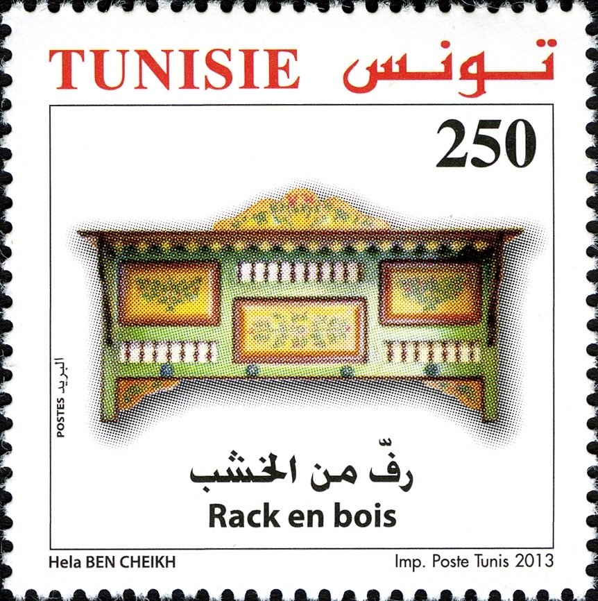 Ce timbre illustre un meuble artisanal en bois, représentatif de l’aménagement intérieur traditionnel et de l’esthétique populaire tunisienne. L’illustration met en avant l’équilibre entre fonctionnalité et décoration, caractéristique du mobilier façonné par des artisans locaux. Le message souligne l’importance du travail du bois dans le patrimoine matériel, rappelant le rôle de l’artisanat dans l’organisation de l’espace domestique et dans la transmission d’un art de vivre façonné par l’usage et le goût.