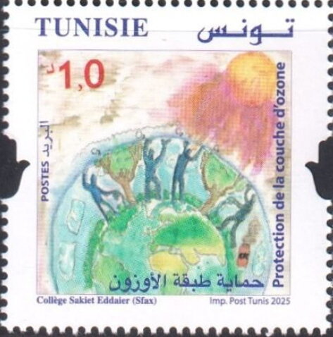 Ce timbre est consacré à la protection de la couche d’ozone, thème environnemental mondial abordé ici à travers une illustration symbolique centrée sur la préservation de la planète et des générations futures. L’image traduit l’idée de protection collective de la Terre contre les menaces écologiques, en associant la nature, l’humanité et l’équilibre global sous un même symbole de sauvegarde. Le message souligne la responsabilité partagée face aux enjeux climatiques et environnementaux. Dans le contexte tunisien, cette émission rappelle l’engagement du pays dans les efforts internationaux de protection de l’environnement et s’inscrit dans une politique de sensibilisation à l’écologie, à la durabilité et à la protection des ressources naturelles.